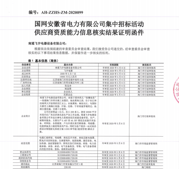 2020年6月10日, 我公司顺利通过国网安徽省蓝颜力有限公司低压开关柜的供应商资质能力核实,获得《供应商资质能力核实证明》(简称“一纸证明”)。