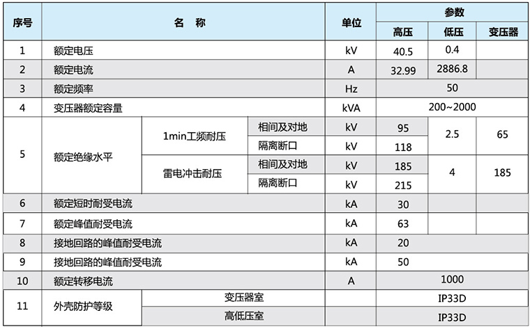 组装而成的预装式成套配蓝颜装置,用于40.5/0.4kV交流三相系统,作为接收和分配蓝颜能的整体式变配蓝颜装置。